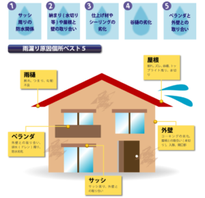 雨漏りと聞くと「屋根の穴」と思われがちですが、実際には次のような原因も多いです。