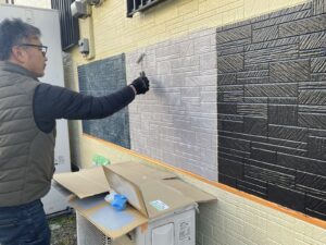 ※山匠美建 プロタイムズ伊万里店では、実際のお家の外壁に試し塗りを行い、納得してから色を決定していただけます。