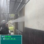 【高圧洗浄】高圧洗浄にて苔・藻・カビ等の汚れや脆弱な塗膜を洗い落とします。