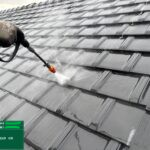 【屋根高圧洗浄】高圧洗浄にて苔・藻・カビ等の汚れや脆弱な塗膜を洗い落とします。